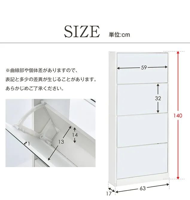 新品 OSJ ミラー付 シューズラック 4段 薄型 スリム 奥行17 木製 ホワイト