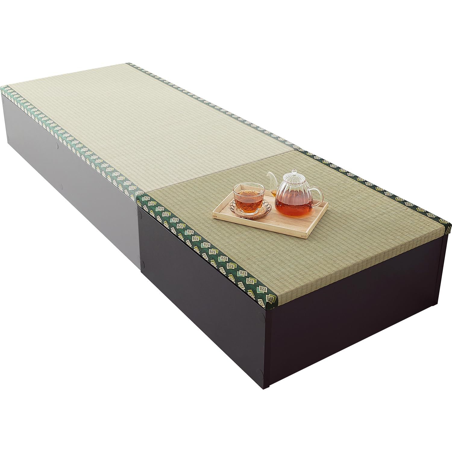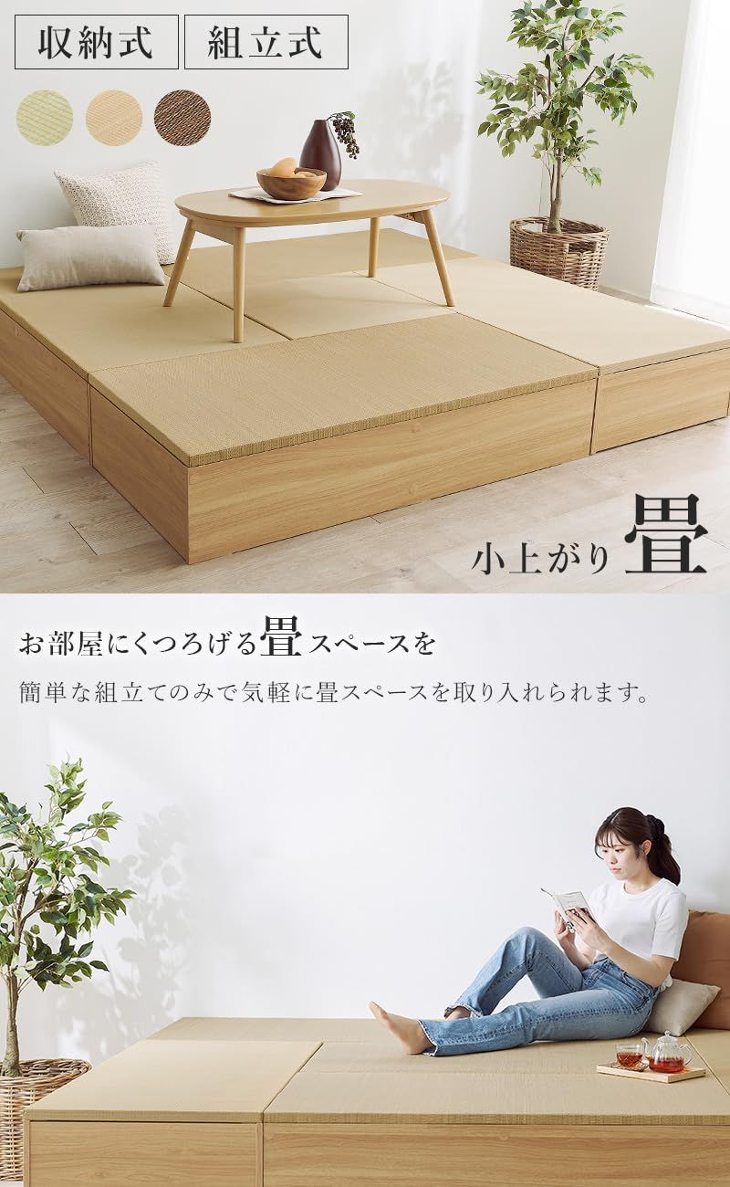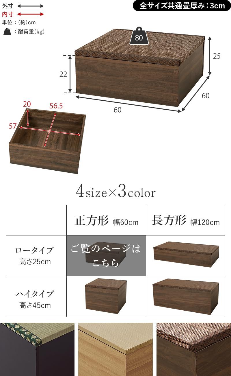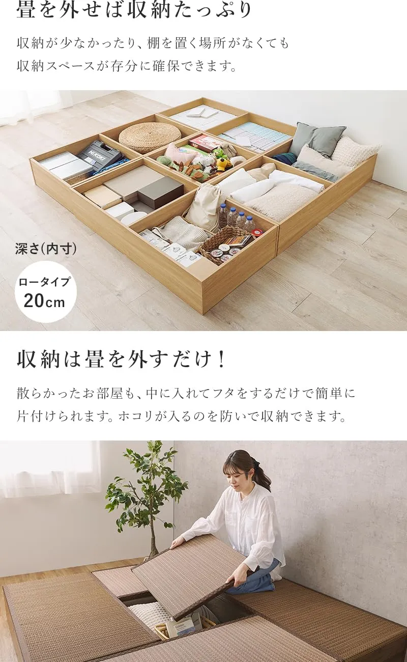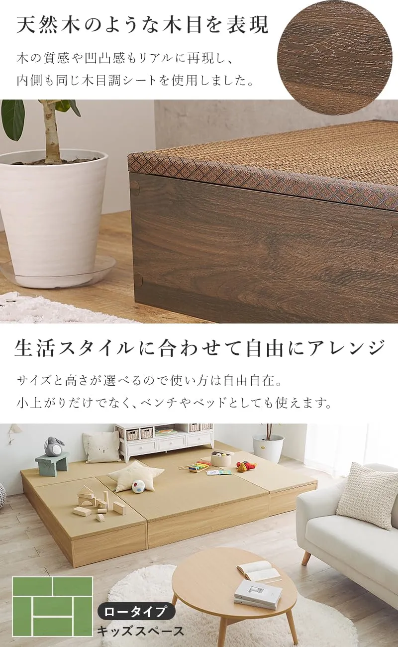 ■ロータイプ/幅60cm:幅60×奥行60×高さ25cm 洋室に和モダンな空間を。畳ユニット「タタミ座」自由に組み合わせてフローリングでも手軽に畳スペースを作れます。 畳部分には天然い草を使用しているので、春夏はひんやり涼み、秋冬はこたつと合わせて、1年中快適なリラックススペースへ。 小上りなので、畳のベッドとして使用したり、ベンチやスツールとしてそのまま腰かけたりすることもできます。キッズスペースとしてお子様の遊び場やお昼寝にも。い草には湿度調節や空気清浄の機能があるので、お子様にも安心してお使いいただけます。 また、フタの取り外しだけで収納スペースになるので、お部屋の広さはそのままで収納を増やしたい方におすすめです。 洋室に和モダンな空間を。畳ユニット「タタミ座」 自由に組み合わせてフローリングでも手軽に畳スペースを作れます。 畳部分には天然い草を使用しているので、 春夏はひんやり涼み、秋冬はこたつと合わせて、 1年中快適なリラックススペースへ。 小上りなので、畳のベッドとして使用したり、 ベンチやスツールとしてそのまま腰かけたりすることもできます。 キッズスペースとしてお子様の遊び場やお昼寝にも。 い草には湿度調節や空気清浄の機能があるので、 お子様にも安心してお使いいただけます。 また、フタの取り外しだけで収納スペースになるので お部屋の広さはそのままで収納を増やしたい方におすすめです。 小上がり畳を設置して立体感を出しつつ、お部屋のアクセントに。 ブラウン×ブラウン、ブラック×グリーン、ナチュラル×ベージュ(縁なし)の3色からお選びください。