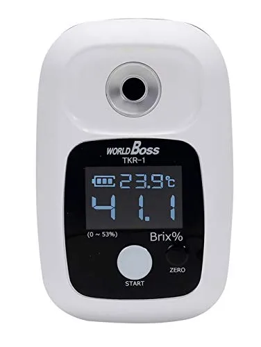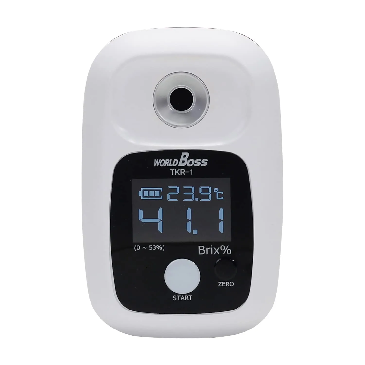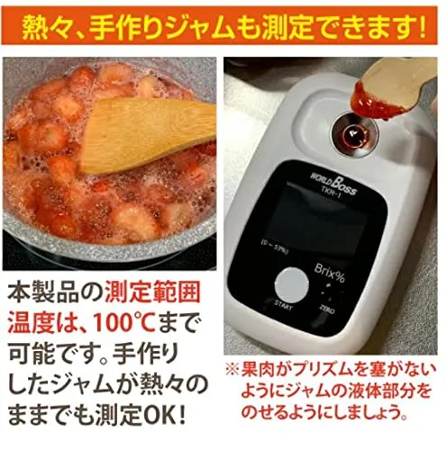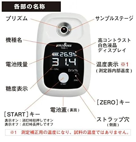 TKR-1 デジタル糖度計「果樹名人」 手軽に持ち運べる 水で丸洗いできる衛生設計(生活防水IP65相当) 試料サンプルがこぼれにくい。 大きく見やすい、反射しずらい液晶ディスプレイ 収納ケース・カラビナ付き 単4形乾電池×2本付属