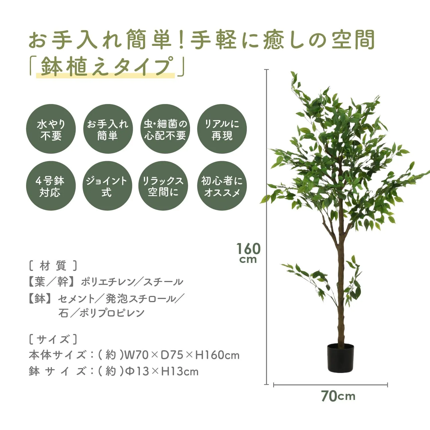 【鉢】セメント/発砲スチロール/石/ポリプロピレン 原産国:中国 ※使用イメージ画像の木製の鉢は本製品には付属しておりません。 高さ160cmで存在感抜群のフェイクグリーン。 グリーンはリラックス効果があるため、お部屋を彩るだけでなく癒しにもなるインテリア! フェイクなので水やりなどのお手入れ不要で、土を使用しないため虫が寄ってくる心配もありません。 ジョイント式で組み立てができ、使用しないときはコンパクトに収納ができます。 配送について、商品のサイズや配送先都道府県によって最適な配送業者を選択しております。 業者・配送方法の指定は承れません。ご了承ください。 万が一の不着、紛失、誤配送の場合など、最後まで責任もって対応致しますのでご安心下さい。 宜しくお願い致します。