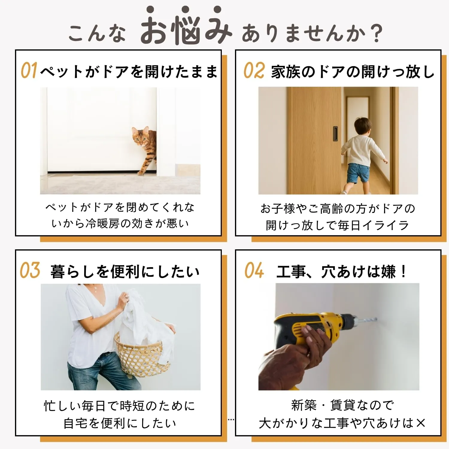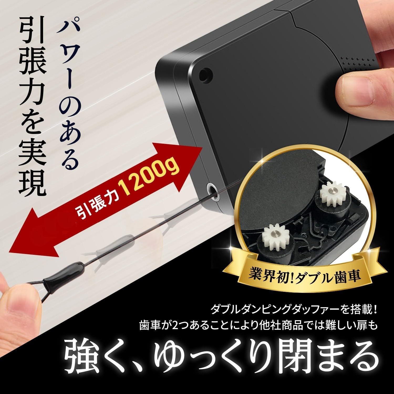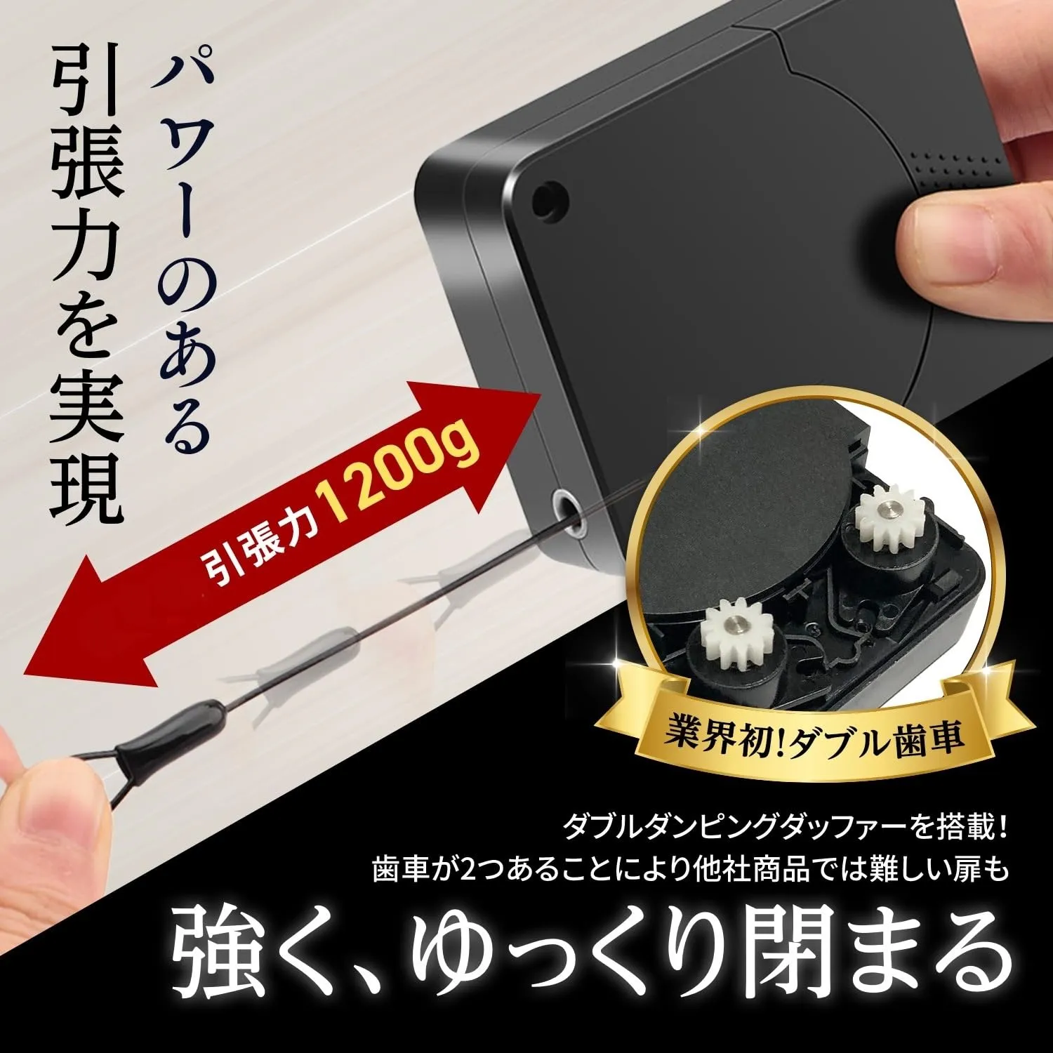 【毎日新聞掲載】 (ブラック800g) 色: ブラック800g [扉を半自動ドアに]後付け簡単で引き戸や開き戸に簡単取り付けができるクローザー。 [ドアの開けっ放し対策に]半自動で閉まるのでペットやお子様のお困りごと解決に。 [ワイヤー調節機能付き]戻る力を調節するダンピングダッファーを搭載。 [強力なパワー]800gの引張力で様々な扉もカバー。 [選べるお取り付け]戸棚や冷蔵庫、開き戸やクローゼット、スライドドアや引き戸などにもOK。 [工事不要かんたん取り付け]3M両面テープで取付可能。ビス止めも選べる。 [バリエーション追加]1200gでは強いというご要望にお応えし、新たに800gが仲間入り。 [扉を自動化で便利な毎日へ]自動でドアが閉まる生活を手に入れよう! 最後までご確認頂き誠にありがとうございました。 上記をご確認頂き、ご購入いただけましたら幸いです。 何かご不明な点がございましたらお気軽にメッセージからお問い合わせ下さい。