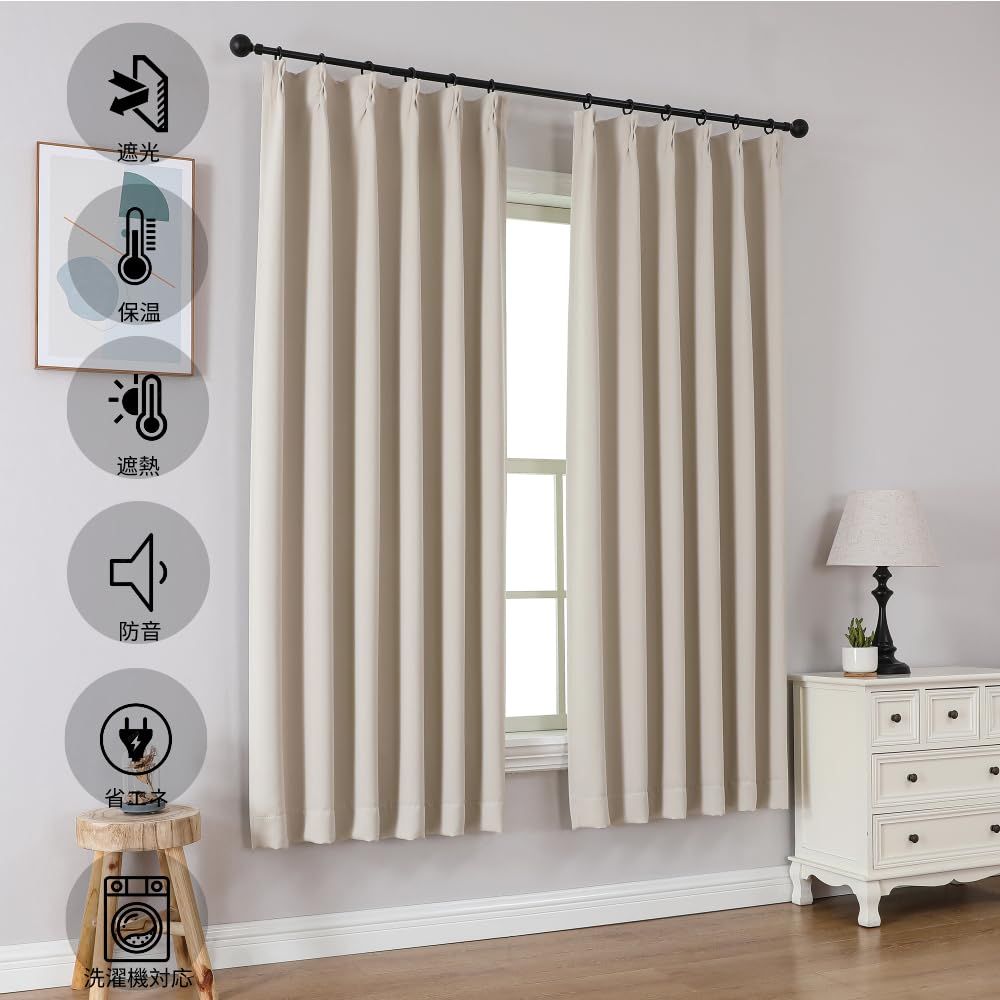 新品 Joydeco 遮光カーテン 2枚組 ライトベージュ 幅100cm*丈200cm ピンチプリーツ カーテンレール対応 防音 保温 省エネ 寝室 リビング 形状安定加工済み UVカット 洗濯機対応