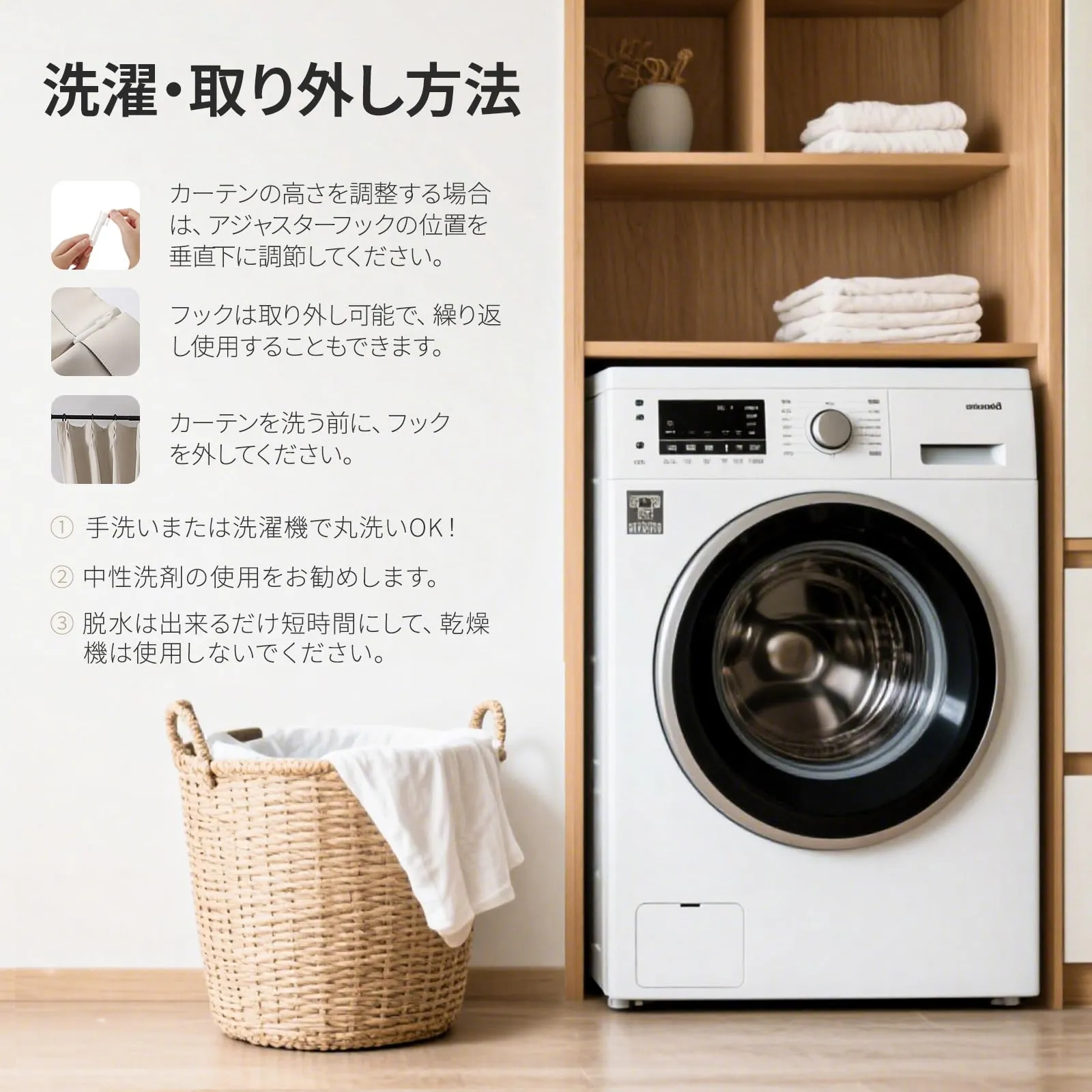 【洗濯方法】カーテンはポリエステル100%で作られており、手洗いまたは洗濯機で洗うことができますので、ご家庭で簡単に洗えます。 お洗濯の際はカーテンを解き、フックを外し、洗濯機に入れてください。 中性洗剤の使用をお勧めします。 カーテンを整理した後、カーテンレールに戻し、吊り下げて自然乾燥させてください。