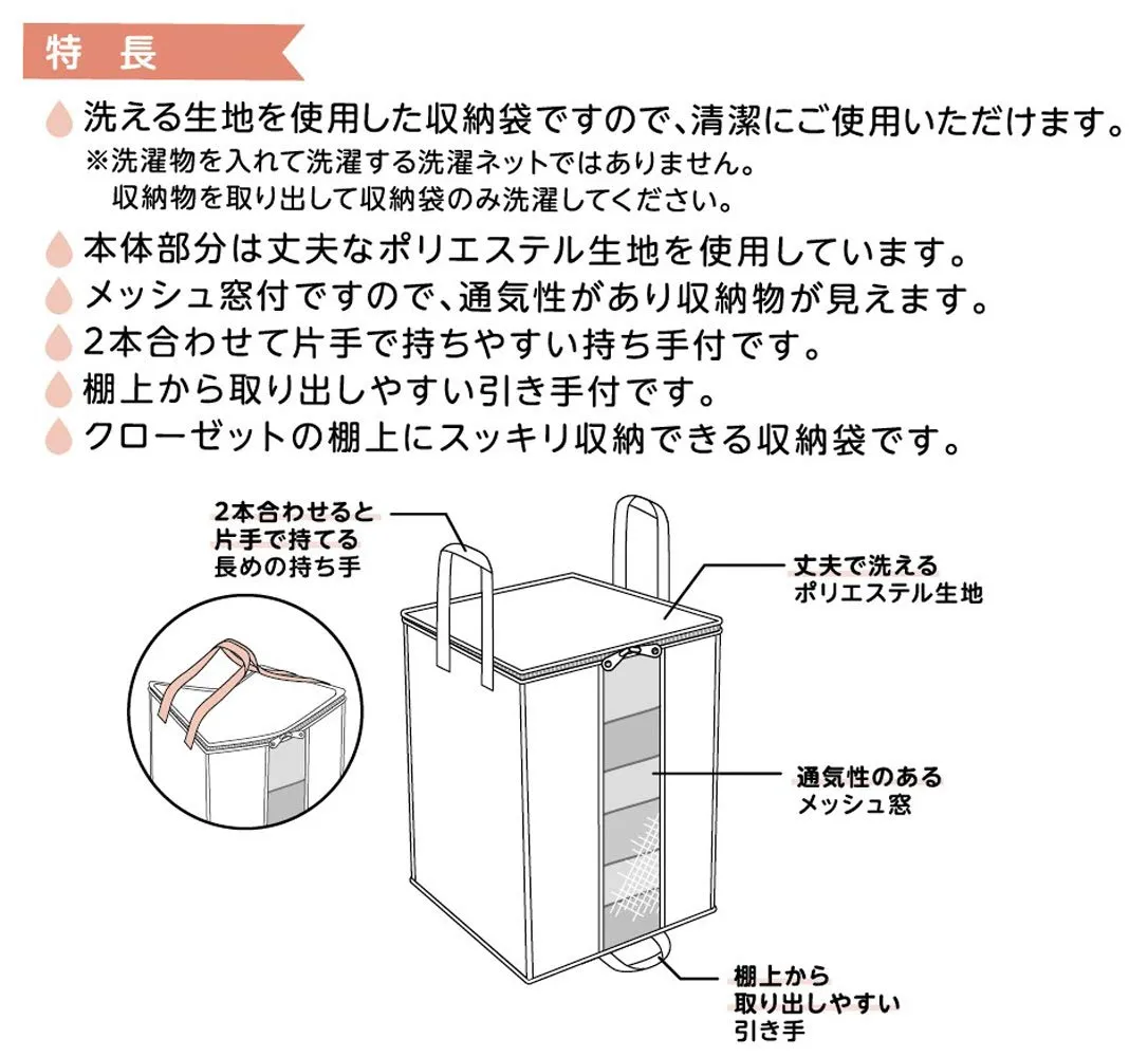 ●本体部分は丈夫なポリエステル生地を使用しています。洗濯の際は収納物を取り出して収納袋のみ洗濯してください。