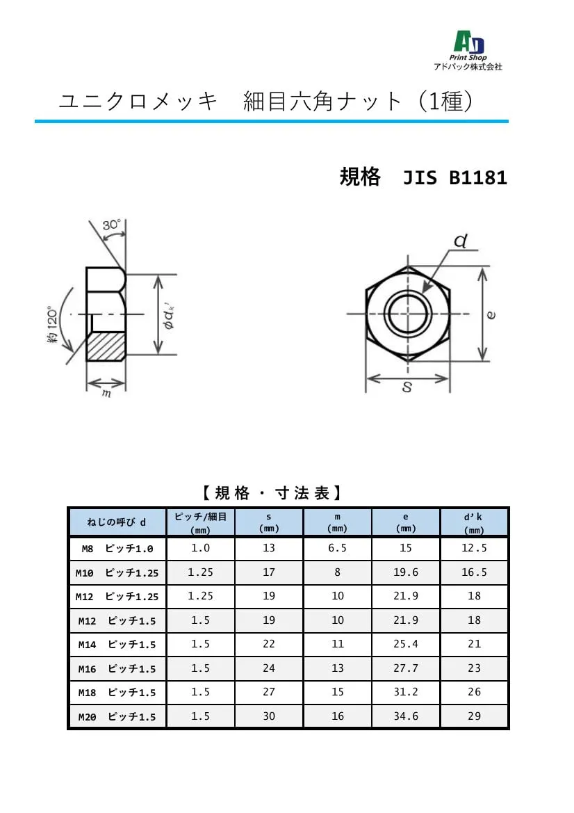 【純国産品】 細目六角ナット(1種) ユニクロメッキ M14 ピッチ1.5