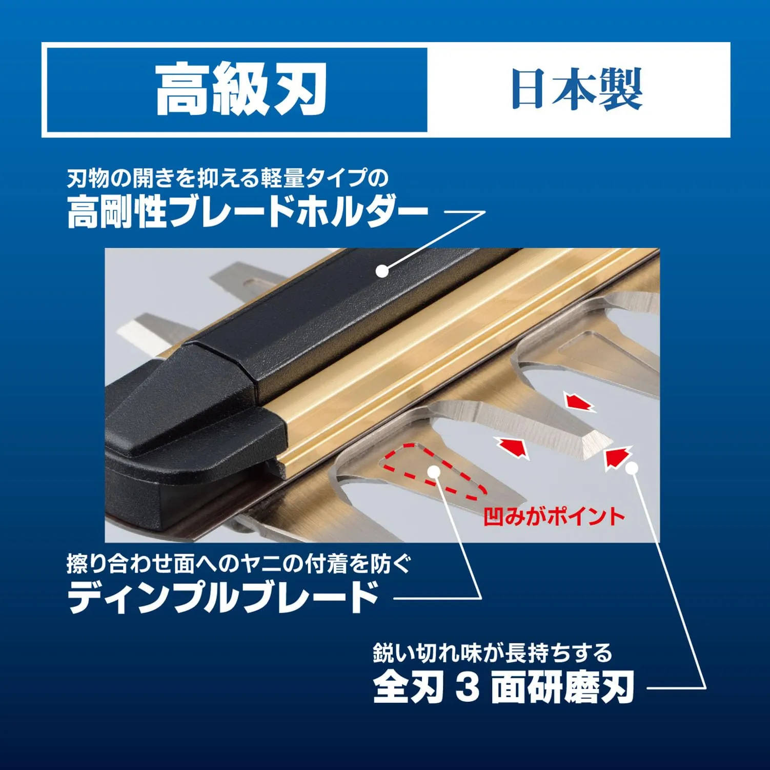 ●ヤニの付着を低減し、刃物の開きを抑える、ディンプルブレード