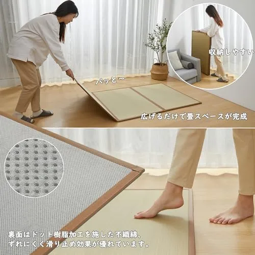 【使い勝手が良い】シングルサイズで、床にお布団を敷いたり、子供の遊び場にしたり、休憩したり、ごろ寝したり、リビング、ベッドルーム、畳の上、フローリングの上、ベッドの上など様々な場面で活躍してくれます;繋がっているからパッと広げるだけで畳空間を作れます;また、折りたたみタイプなので、ちょっとしたスペースでも使用できる上、収納や持ち運びも便利