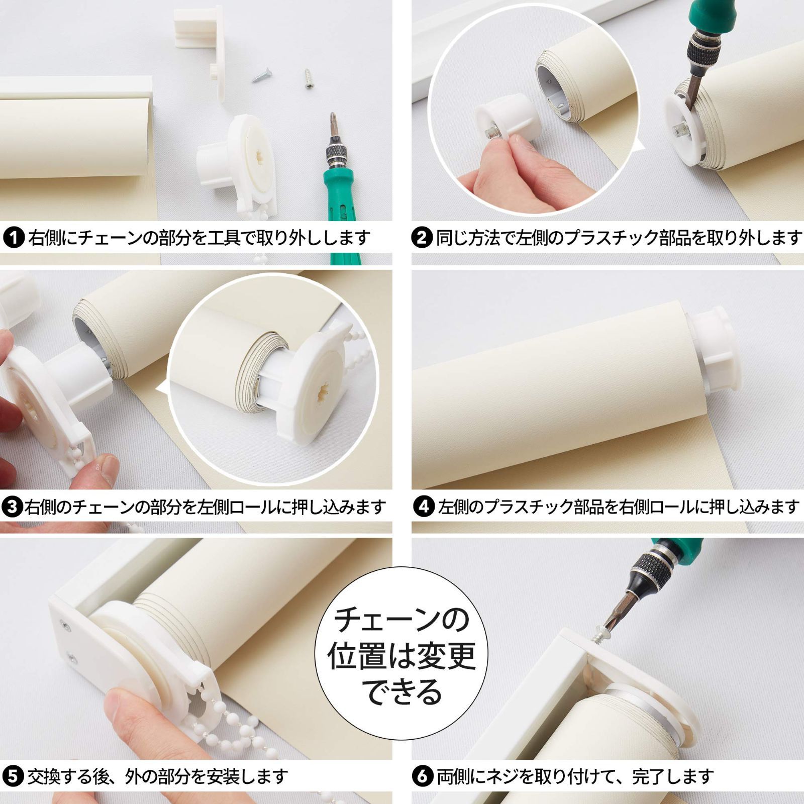 【取り付け方法】天井付けと正面付けタイプは窓枠にビス穴をあけネジで取り付けます。窓枠内に取り付ける「 天井付け」は圧迫感がなく、窓際にエアコンや家具を設置することもできます。窓枠外に取り付ける「正面付け 」はすき間から入る光や外からの視線をしっかり防ぎます。また、既存のカーテンレールを利用しても簡単に取り付けられ、穴をあけられないため賃貸住宅にも適用します。さらに、チェーンの位置は左右で変えられ、利き手 に合わせるのも便利です。
