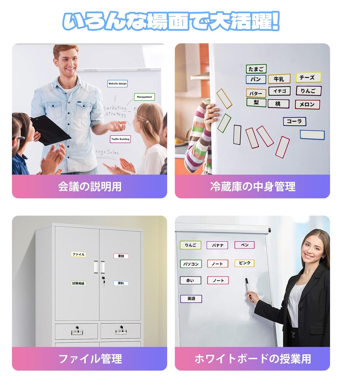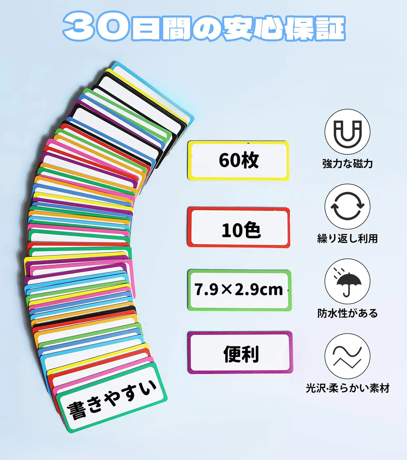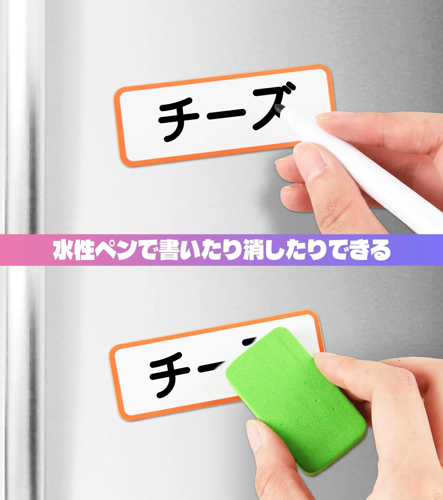 【繰り返し利用】書き込み・消去可能、水洗い可能。粘着剤がないので、何度も再利用できます。磁気ネームプレート表面にはPETフィルムを採用し、ホワイトボード用水性マーカーで繰り返し書き込みができます。