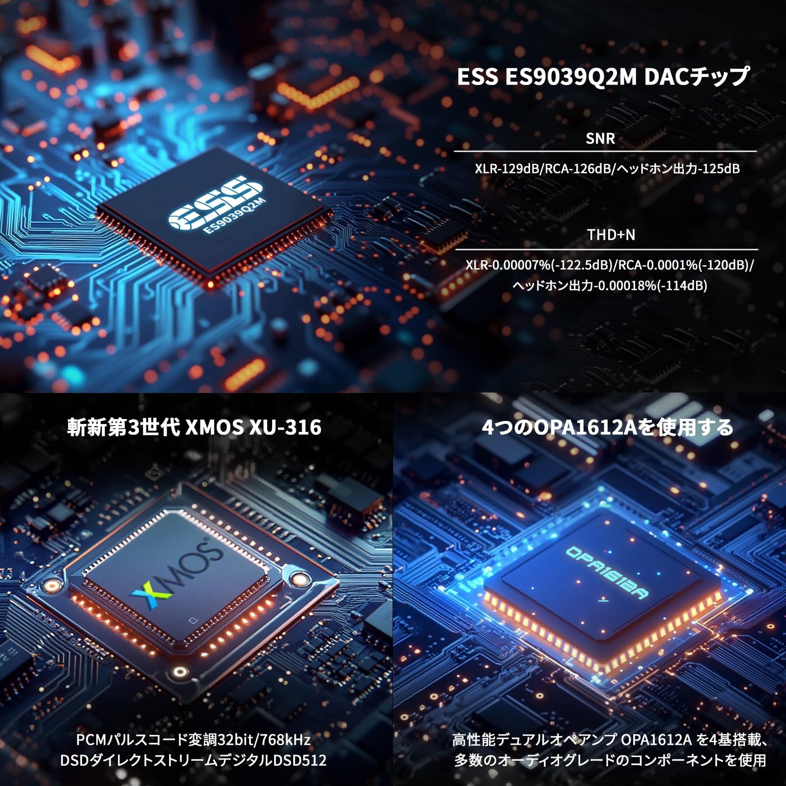 【4基のOPA1612AフラグシップOPアンプを搭載!】オーディオDAC部には、テキサス・インスツルメンツのフラグシップデュアルOPアンプ、OPA1612Aを4基直接搭載。音楽信号の伝送におけるロスや染を完全に排除し、至高の音質を追求するオーディオファンに最適な設計です。