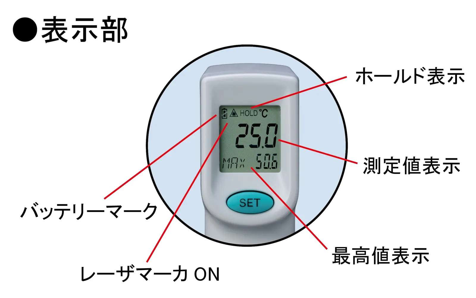 サークルマーカで測定領域を一目で把握できます。 放射率の3点切り替えが可能です(0.95,0.70,0.30) 最高値表示機能付 バックライト機能付 HOLD機能付 オートパワーオフ機能付