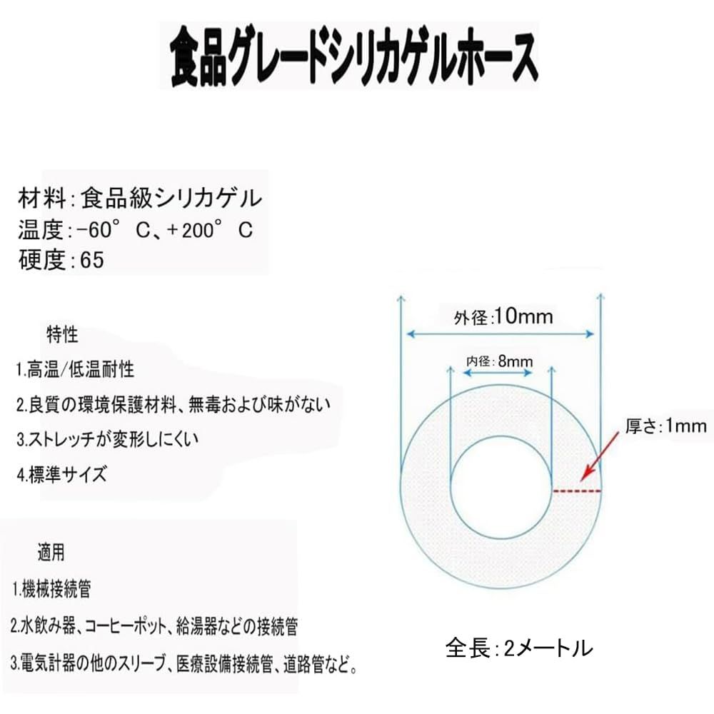 【サイズ】製品名 : シリコンチューブ 。内径:8mm 、外径:10mm 、壁厚さ:1mm 。長さ:2m 。