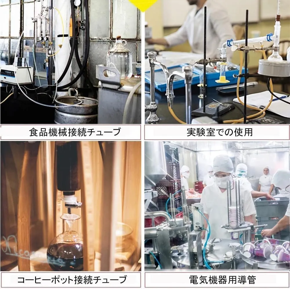 【適用】理化学機器のチューブ、耐熱用保護カバー、風呂用温水循環器のホース、自動販売機用チューブ、蠕動ポンプ、吸い上げ、排水管、アクアポニックス、水槽用水エアホースなどに適用します。
