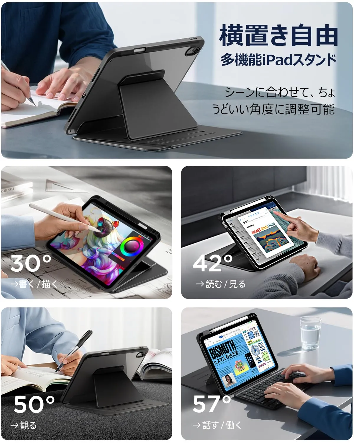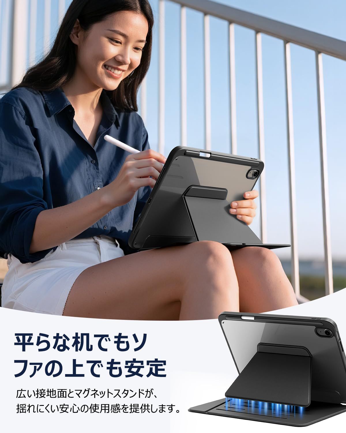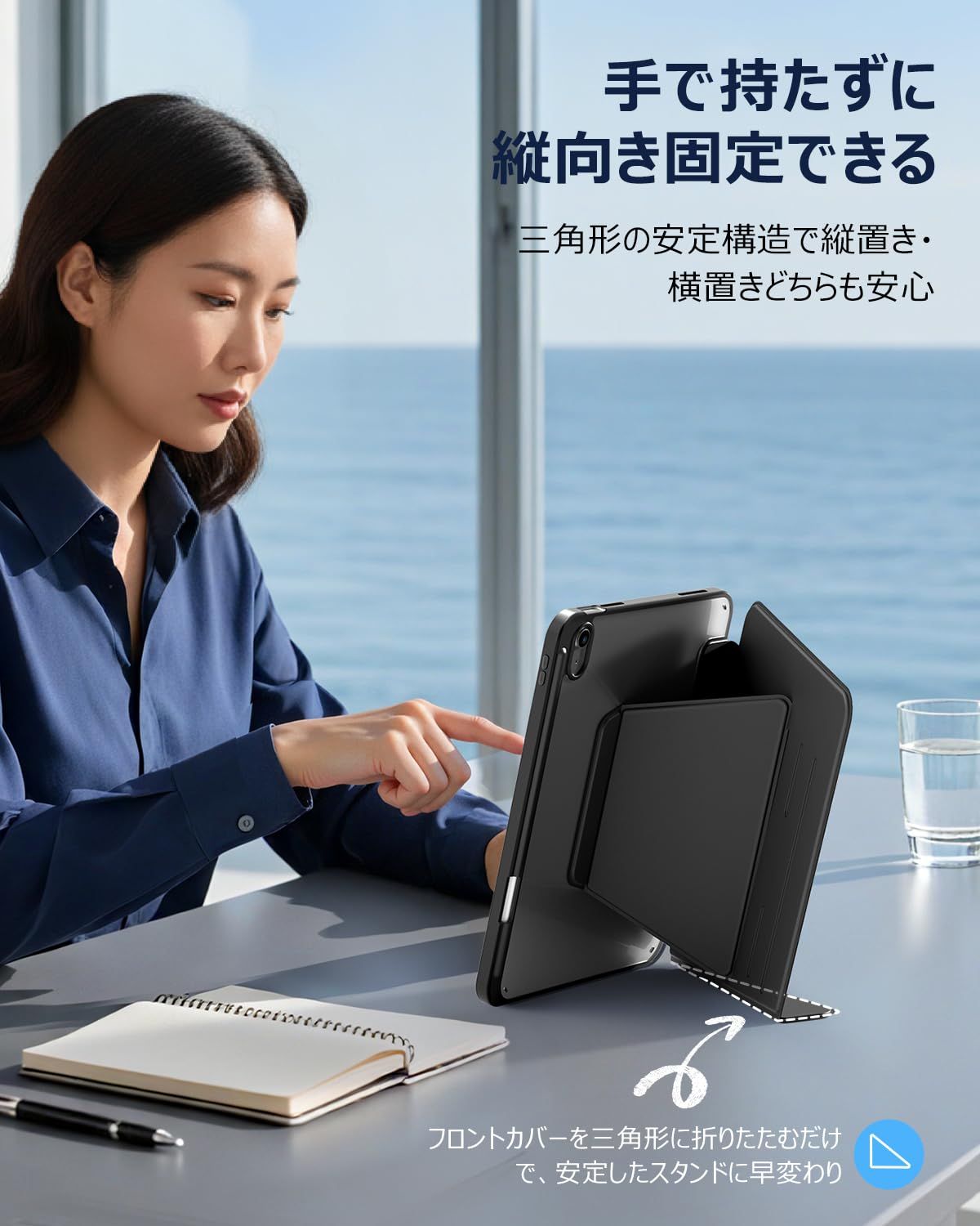 【縦横多角度マグネットスタンド】ipad a16 ケースは段階調節可能な横向きモードに加え、縦向きモードも搭載しております。ipad A16ケース マグネットがすごくしっかり固定してくれて、画面が揺れる心配が全くないんです。急に仕事のプランを変更しなきゃいけない時も、角度を書き込みモードに調整すれば、タイピングやコメント追加もスムーズで、色んなシーンで簡単に角度が切り替えられて本当に便利です。