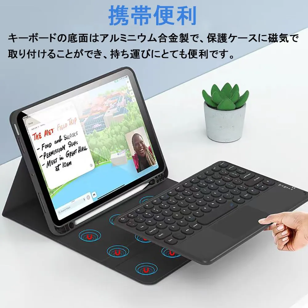【薄型軽量・携帯便利】このiPad用キーボードのサイズは24.3*17*0.6cmで、ipad airとほぼ同じサイズです。重さは225gで、薄くて軽く、コンパクトなデザインで場所を取らず、キーボードの底面はアルミニウム合金製で、保護ケースに磁気で取り付けることができ、持ち運びにもとても便利です。