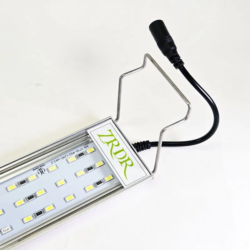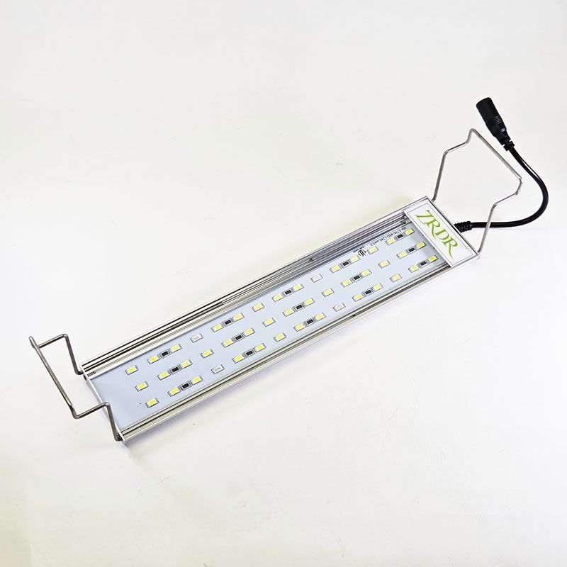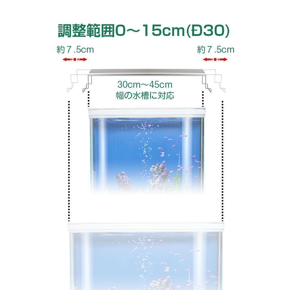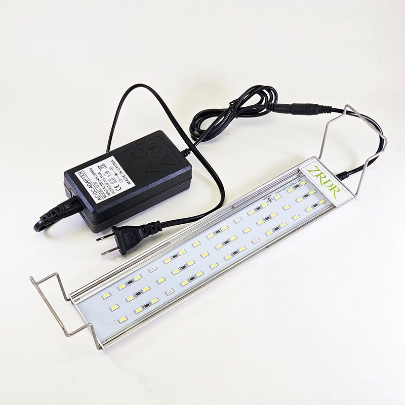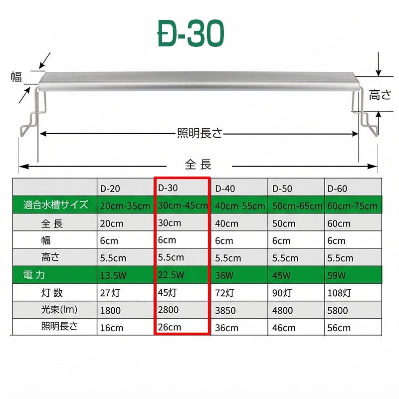 【製品仕様】 ・ライト色:ホワイト ・サイズ:約30cm(コンパクト設計) ・適合水槽サイズ 30cm~45cm ・LED数:45灯 ・ルーメン:2800lm ・電源:AC100-240V DC12V ・電力:22.5W ・機能:無断階調光可