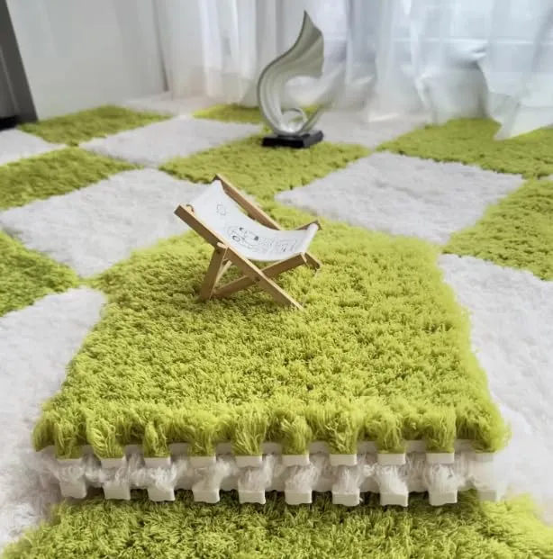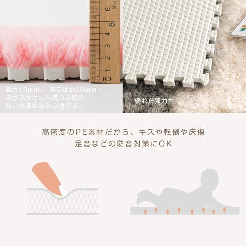 【ふわふわの極上肌触り】 厚手の絨毯タイプのジョイントマットです。約20mmのモコモコとした毛足が、優しく足元を包み込むボリューム感。約10mmのウレタン層を内蔵しているため、ふかふかとしながらも沈み込みすぎない、安定した快適な踏み心地を実現します。