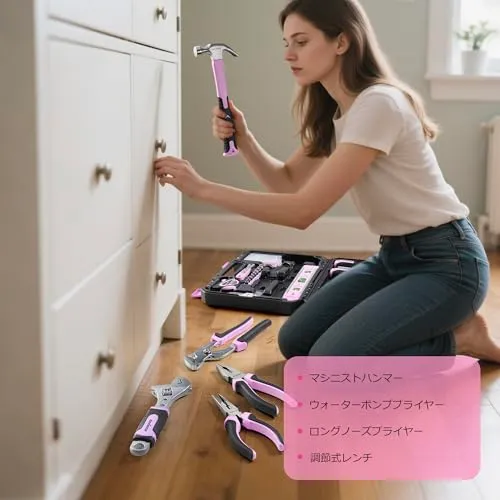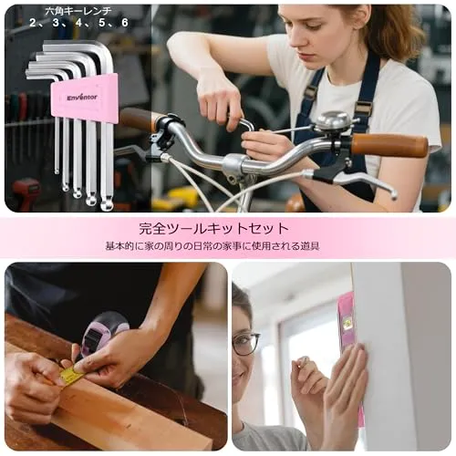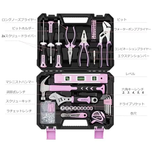 【家庭用工具セット】Enventorホームツールセットは使用頻度の高いセットが含まれています、家具の組立や機械などの修理、DIYに加え専用工具を要しない自動車整備などにも対応した充実のセット内容です。プロ仕様の精密ドライバー、六角レンチ、電工エベチ、レンチ、ハンマー、巻尺、カッターナイフ、シザーズ、木材穴開けセットなどが含まれています。