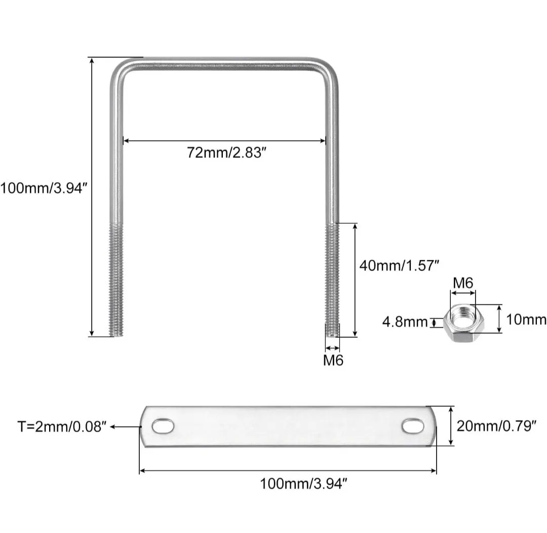 【仕様】製品名:M6 角Uボルト。長さ:10cm。内幅:7.2cm。ネジサイズ:M6。セット内容:六角ナット+ロックプレート。ナットサイズ(幅×厚さ):10mm×4.8mm。ロックプレートサイズ(厚さ×長さ×幅):2×100×20mm。パッケージ:2セット。