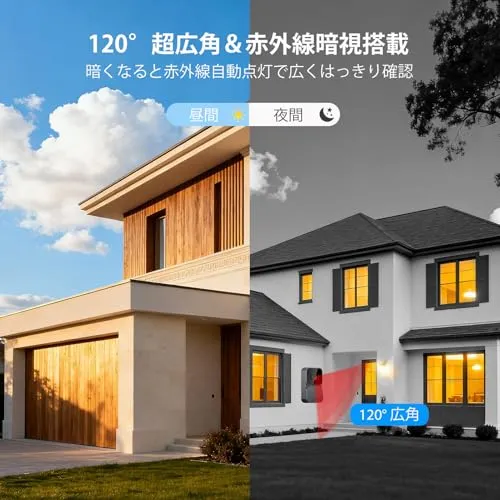 【赤外線LED搭載120広角レンズ】赤外線LEDライトを備えた120広角カメラが、暗くなると自動で赤外線を点灯。4.3インチのワイドモニターで夜間でも来訪者の顔を鮮明に確認できます。狭いスペースでも広範囲をカバーでき、玄関はもちろん、店舗・事務所・受付など幅広い場所にドアベル・チャイム・防犯カメラとして簡単に設置可能です。録画映像の再生時には録画された日付・日時も確認でき、防犯対策にもおすすめのワイヤレスチャイムです。