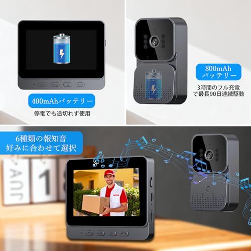 【双方向通話配線不要で3通りの設置6種類の報知音】子機・モニター親機ともにマイクを搭載し、来訪者とリアルタイムで双方向通話が可能なワイヤレスインターホン。手が離せないときや家事中でも応対でき、配達対応もスムーズです。6種類の報知音で好みに合わせ設定でき、配線工事不要で卓上・壁掛け・両面テープの3通りで簡単設置可能。玄関まで行く手間が減り、高齢者や子どもも安心して使え、防犯や宅配対応にも最適なワイヤレスドアホンです。