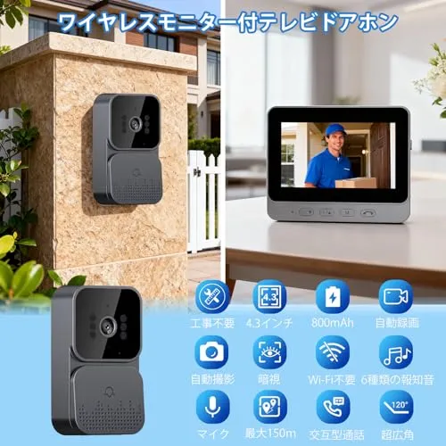 ZAIDER テレビドアホン インターホン カメラ付き ドアホン ワイヤレス 工事不要 【双方向通話/自動録画】 赤外線LED 暗視撮影 2.4Ghz無線 WI-FI不要 玄関チャイム USB充電 超広角 防犯カメラ 日本語説明書★m