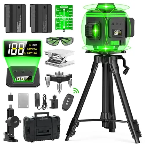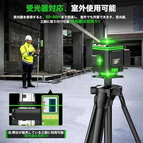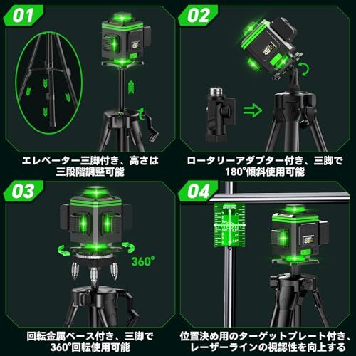 【改良された16ラインレーザー墨出し器】改良点:エレベーター用の四段階調整可能な三脚が付属しており、ロータリーアダプター付きであるため、三脚を傾斜させて使用することもできます。改良点:電量表示の LCD ディスプレーが搭載されており、作業中にバッテリーの残量を一目瞭然に確認できます。改良点:SEESII の水平器レーザーは、先進的なレーザーテクノロジーを採用しており、非常に高い精度を実現しています。グリーンレーザーを採用しており、精度と輝度も高くなっています。2x360 の水平線と 2x360 の垂直線が部屋全体をカバーします。レーザー基準はクラス 2、1MW 以下です。