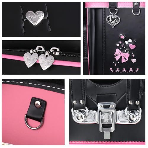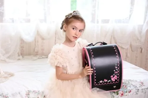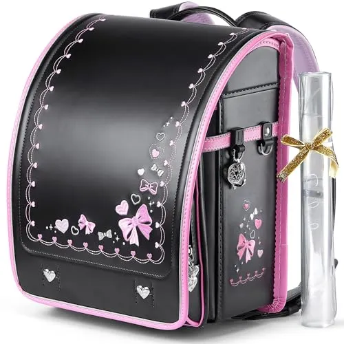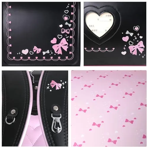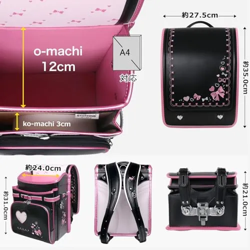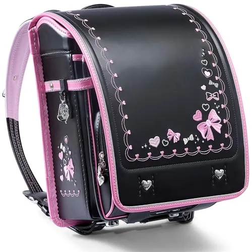 【新品】ランドセル 女の子 小学生 通学カバン 人工皮革パール生地 ワンタッチロック ハート 蝶結び刺繍 黒 ブラック 67d27091