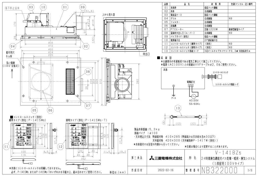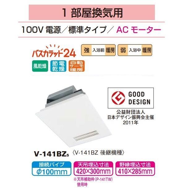 三菱 バス乾燥暖房換気システム 浴室換気乾燥暖房器 V-141BZ5+P-141SW5 24時間換気機能付 1部屋換気用 100V バスカラット24+スイッチセット