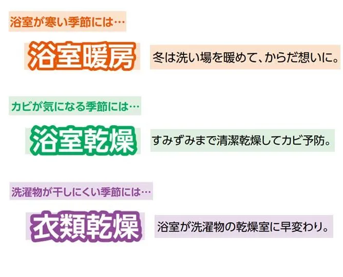 ●衣類乾燥・浴室乾燥・暖房・涼風(※)・換気の1台5役 ※「風乾燥モード」による涼風になります。