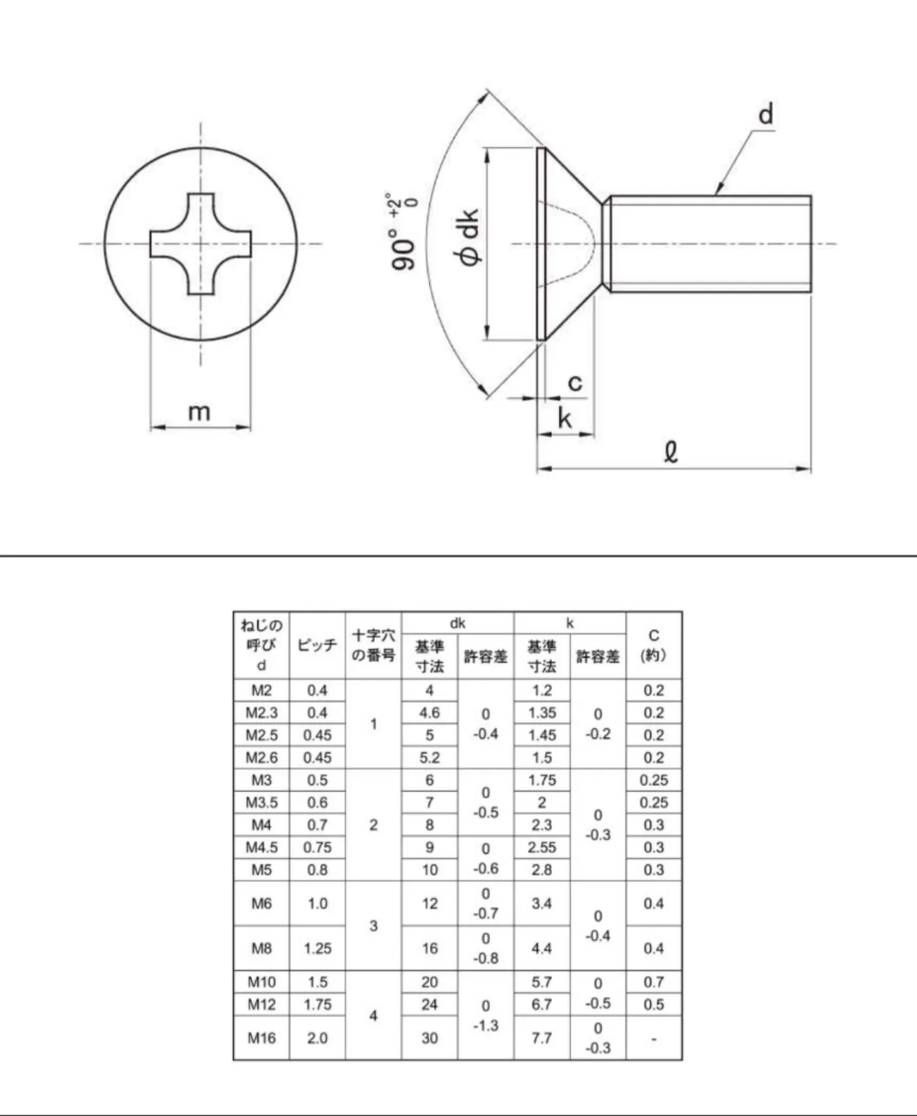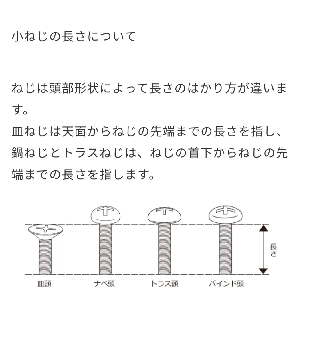 ●頭部分の直径は呼びの2倍です。(M2.5の場合5mm) ※皿頭ねじの長さは他のねじとは違い頭部も含めた全体の長さです。(ナベ頭、トラス頭、バインド頭の長さは首下からねじの先端までの長さです。)※