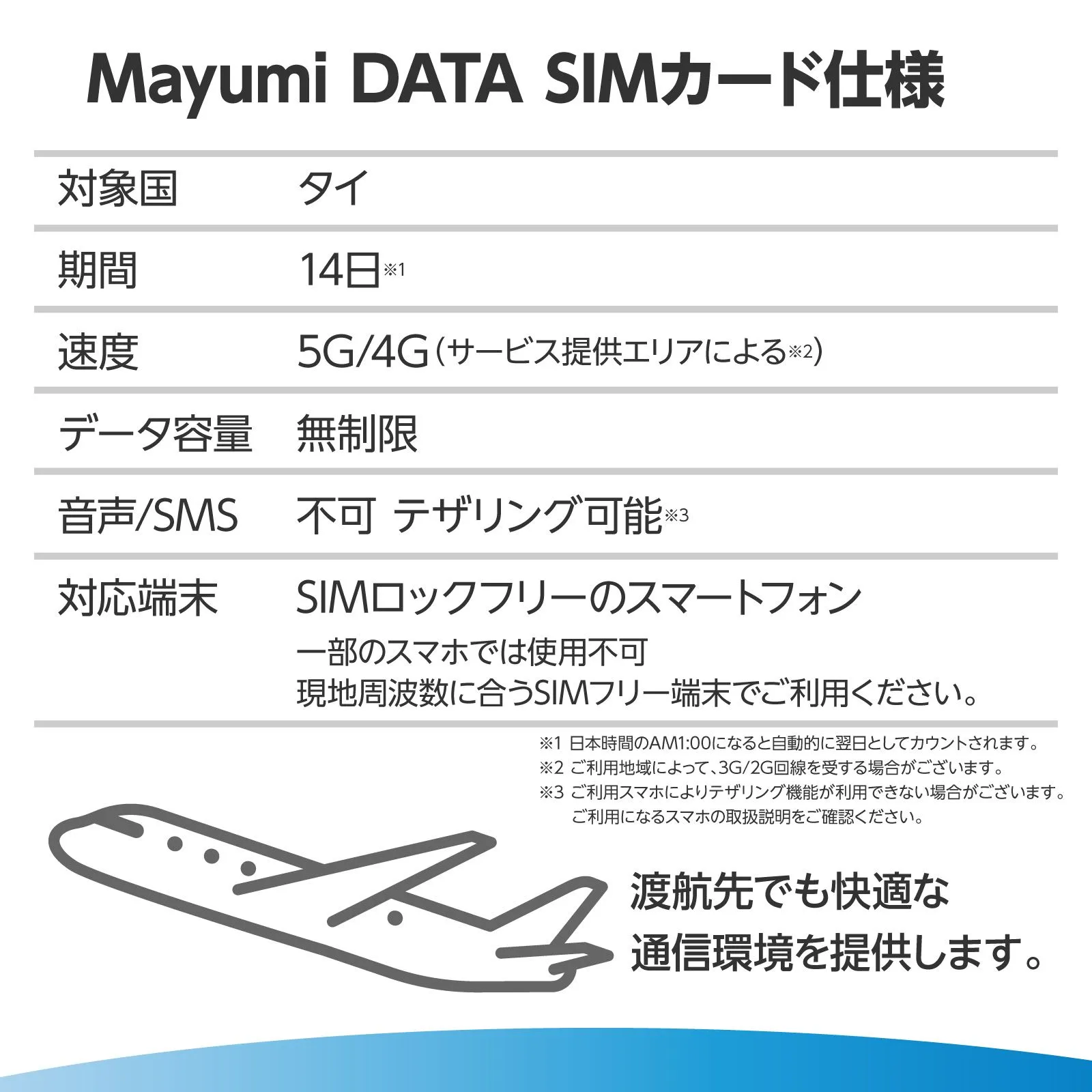 【ご利用方法】タイSIMカードを端末に挿入するだけで、ネットワークをご利用いただけます。本サービスはデータ通信専用のため、音声通話やSMS(電話番号なし)はご利用いただけません。 端末の周波数と現地の対応周波数が合っているがご確認ください。海外ローミング対応端末でご利用ください。 本商品は返品・交換不可となります(未使用時でも例外なし)。 利用方法 ①現地にてSIMカードをSIMフリー端末に挿入セット ②設定から読み込んだSIMのモバイルデータとローミングをON ③設定完了!インターネットが使用可能です *当SIMカードは自動APN設定が行われますが、ご利用頂く機種やOSよって自動設定されない場合がございます。 その際にお客様にてご対応お願いいたします。 ご利用にあたって注意事項