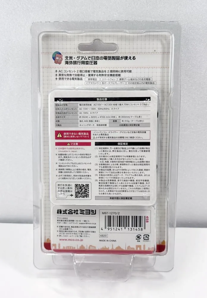 【HY】【新品】MCO ミヨシ 海外旅行用変圧器 MBT-1270/2 120V地域対応 70W 北米 グアム ハワイ 海外電圧対応 トラベル変圧器 旅行用コンバーター[ゆうパケット発送、送料無料]HY003