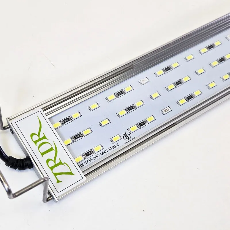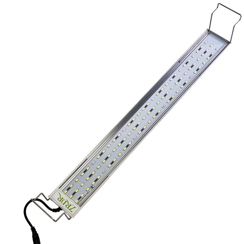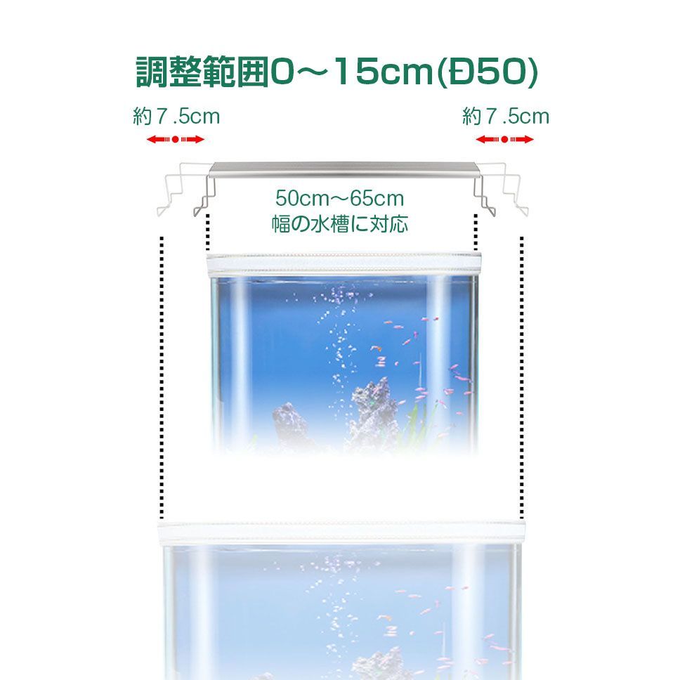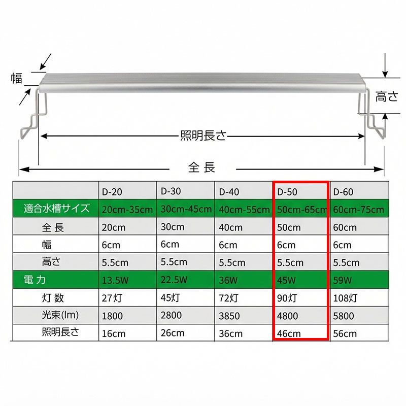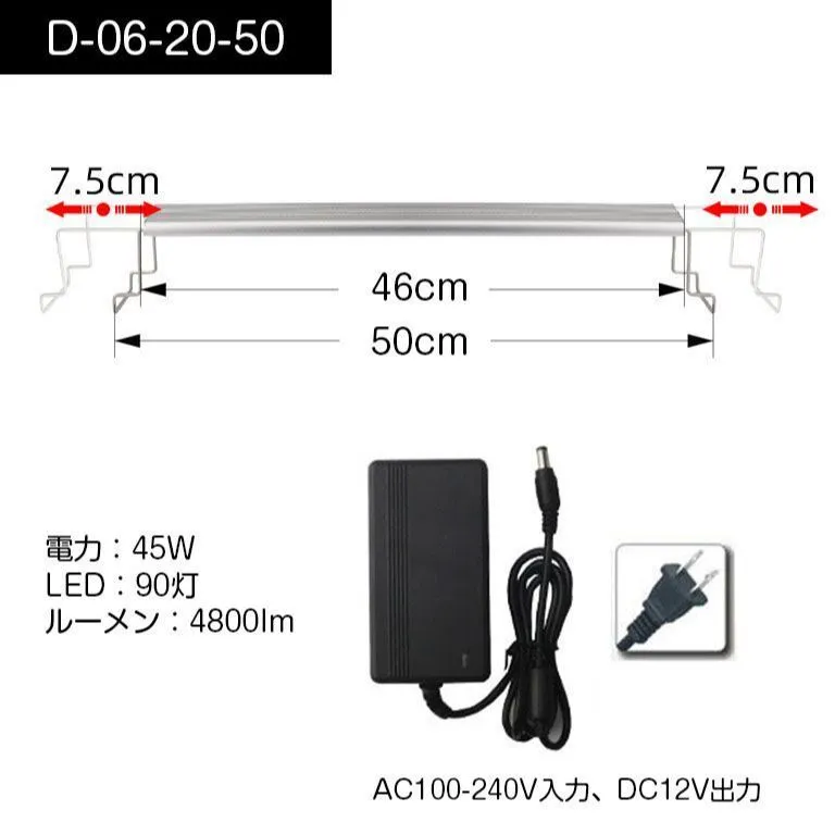 【製品仕様】 ・ライト色:ホワイト ・サイズ:約50cm(コンパクト設計) ・適合水槽サイズ 50cm~65cm ・LED数:90灯 ・ルーメン:4800lm ・電源:AC100-240V DC12V ・電力:45W ・機能:無断階調光可