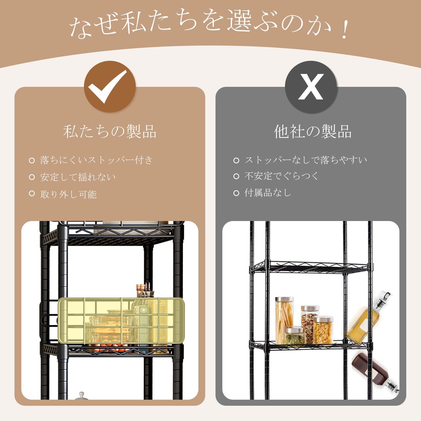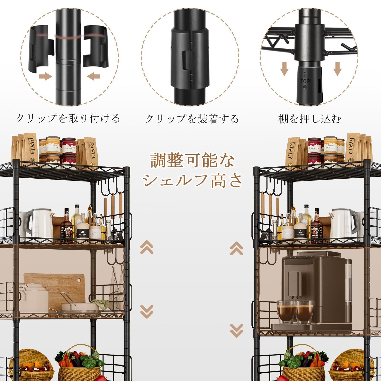 「頑丈な構造」キッチン用スチールラックは、頑丈な金属フレームで作られており、耐久性に優れ、長期間使用しても安心です。安定したデザインで、重い物をしっかりと収納できる信頼性のある選択肢です。