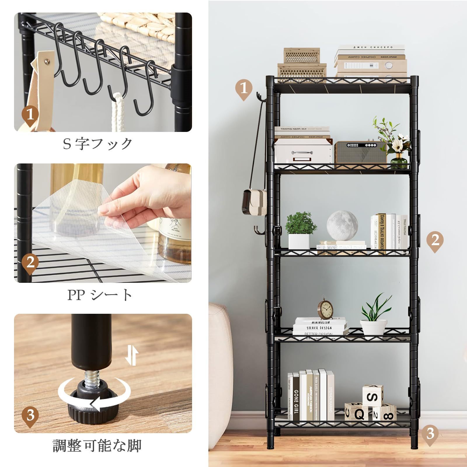 「簡単な組み立て」この重荷重対応スチールラックは、特別な工具なしで簡単かつ迅速に組み立てられます。スタイリッシュなデザインはインテリアにモダンな雰囲気を加えるだけでなく、清掃も簡単です。