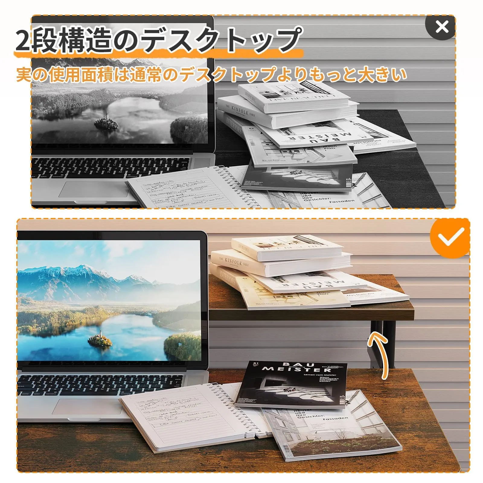 【モニター台付き、卓上の使用面積を広げる】上部のラックは正しい座り姿勢に導いて、首や肩への負担を軽減して、長時間座ってもラクラク~2段構造の板なので、実の使用スペースは同じの奥行の天板よりもっと大きく、仕事の効率が大幅にアップ。