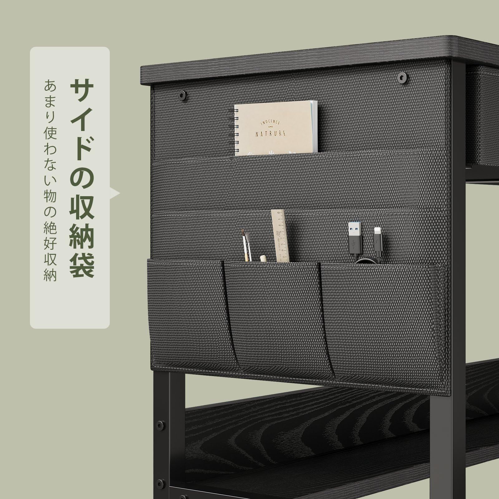 【便利なサイドポケット付きデスク】デスクの側面には収納ポケットが付いており、スマートフォンやリモコン、ノートなどの小物を手軽に収納できます。スペースを有効活用し、使い勝手が向上します。