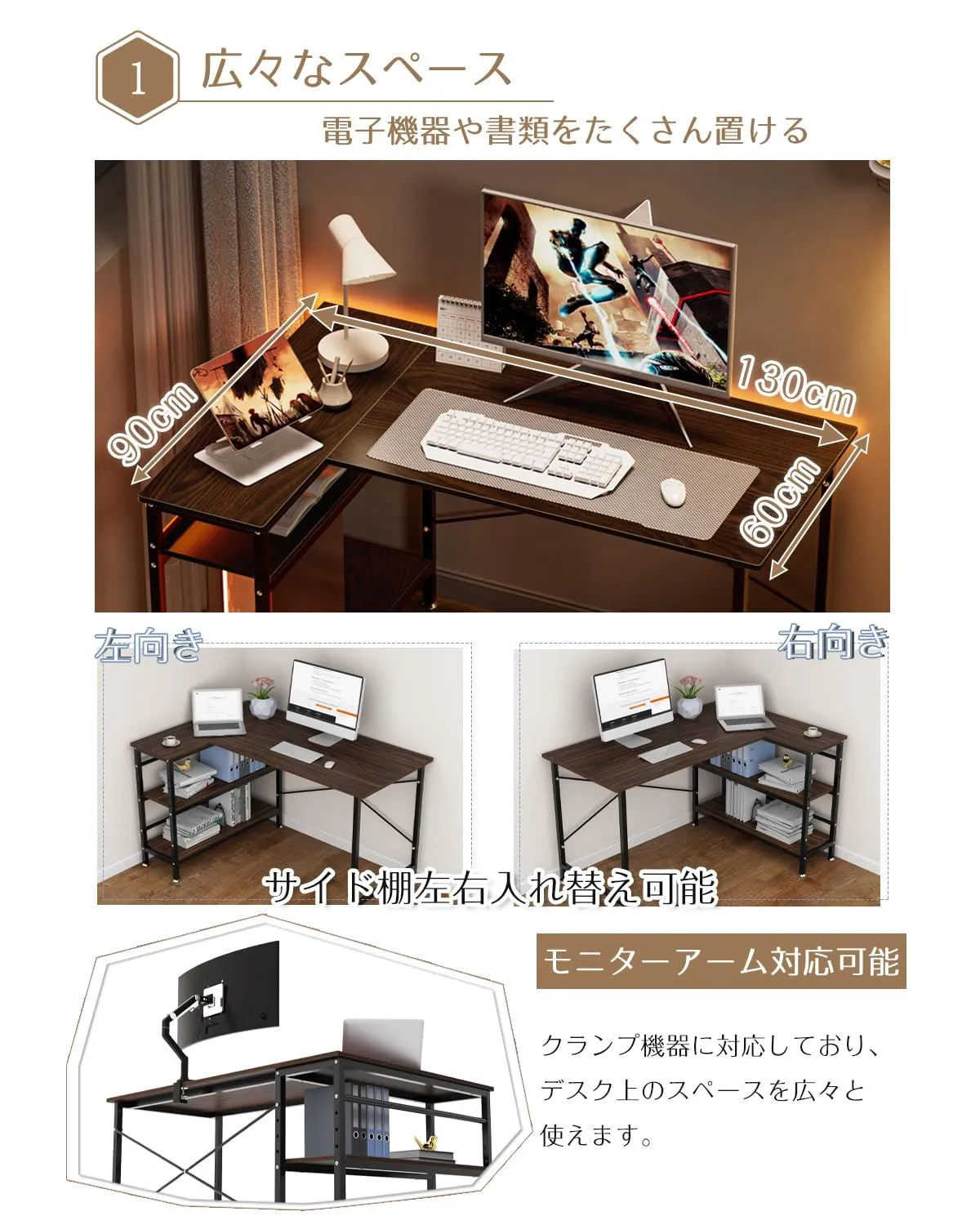 【??作業がしやすいL字型??天板幅130x奥行90cm】??コーナーにぴったりと収まるL字型、広くて手が届きやすく、部屋のスペースを有効活用できます。??天板幅130x奥行90x奥行60cm、モニター、ノートPC、書類などちょっとした仕事に必要なアイテムをたっぷりと収納できます。