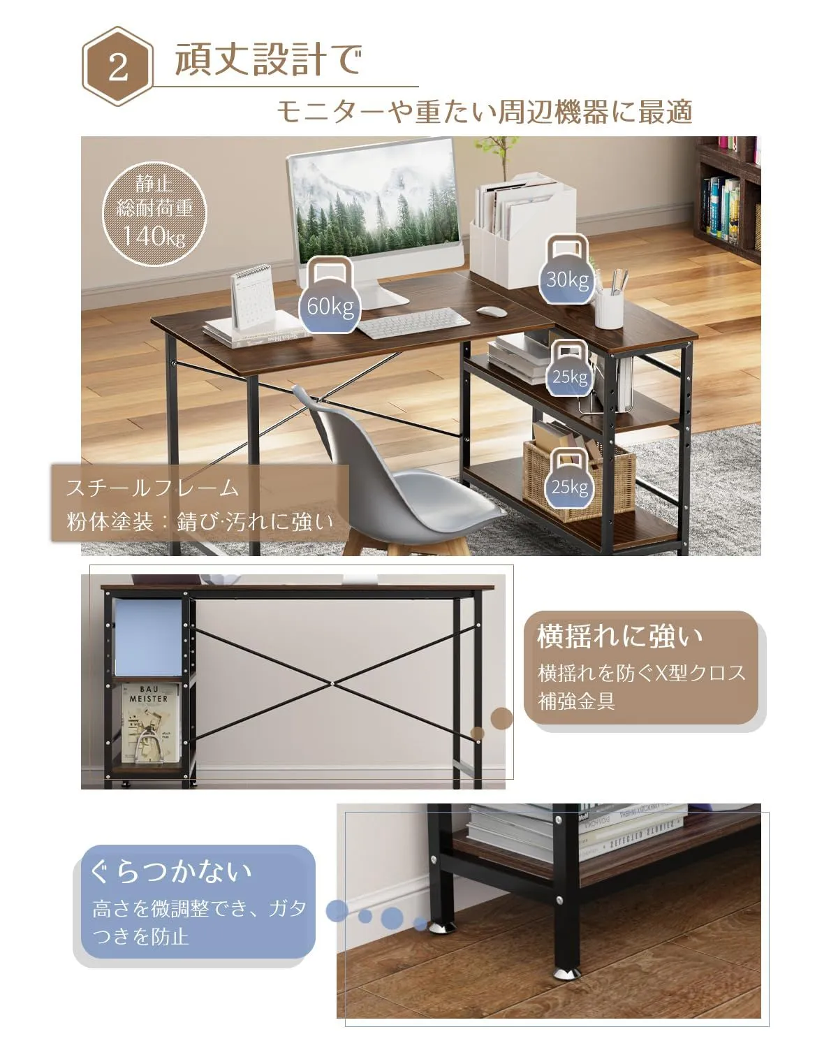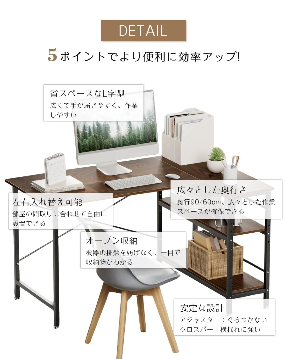 【数量限定】横揺れ&グラつき防止 省スペース 傷・汚れ・水分・熱に強い天板(メラミン加工) フィスデスク PCデスク 木製 机 おしゃれ コーナーデスク ゲーミングデスク 書斎 DEWEL 在宅勤務 一体型のラック付き 幅130cmx奥行90cm左右入れ替え可