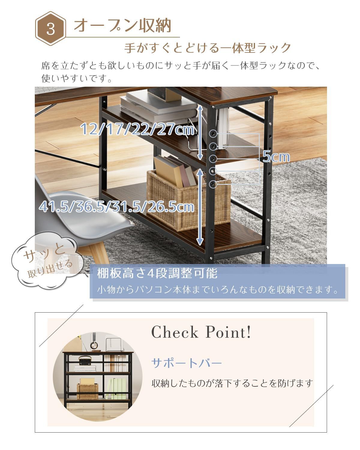 【??一体型のラック??棚板高さ調整可能??落下防止】??サイドに一体型のラックが付いており、一目で収納物を確認出来て、書類など使いたい時もサッと取り出せます。??棚板は約5cm(下棚:30-45cm)の間隔で調節できて、小物からパソコン本体まで収納できます。棚板を取り外してもっと背の高い物も収納できます。??サイドにサポートバーついて、置く物の落下を防ぎます。