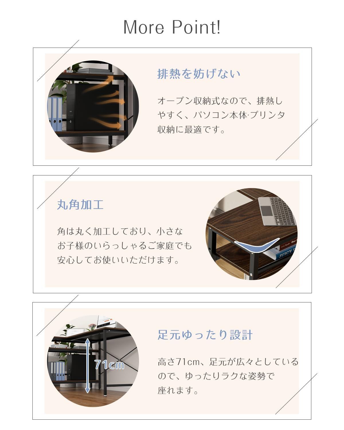 【??オープン収納??足元広々??丸角加工】??オープン収納式のため、パソコン周辺機器の排熱を妨げなく、パソコン本体・プリンタ収納に最適です。??天板下の高さはゆとりの71cmのため、ゆったりラクな姿勢で座れます。??丸角加工を施しており、お子様にも優しいスタイルです。