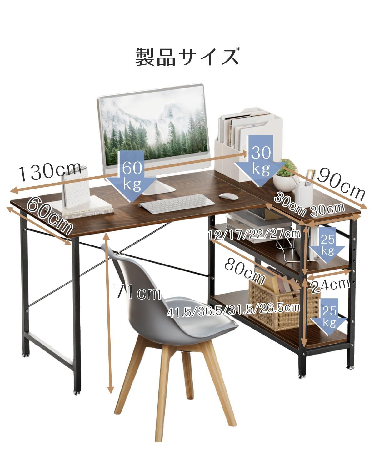 【日本語サポート&商品仕様】??お手元に届く際、不具合が発生したら、メールや電話でご連絡下さい、迅速に対応させていただきます。 ??サイズ:幅130x奥行90x奥行60x高さ75cm 耐荷重:大きめな天板60kg、小さめな天板30kg、棚板(一つあたり)25kg 素材:天板/棚板:パーチクルボード(厚さ15mm、エコで老化防止、断熱性、リアルな木目) フレーム:スチール・粉体塗装(エコ) ブランド D EWEL 形状 L字型 デスクの種類 コンピューターデスク 商品の寸法 130奥行き x 90幅 x 75高さ cm 色 ウォルナット スタイル モダン ベース材質 木材 表示を増やす 最後までご確認頂き誠にありがとうございました。 上記をご確認頂き、ご購入いただけましたら幸いです。 何かご不明な点がございましたらお気軽にメッセージからお問い合わせ下さい。