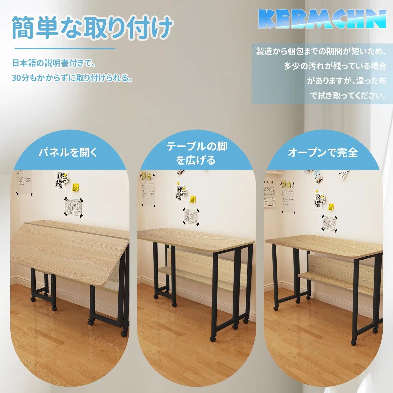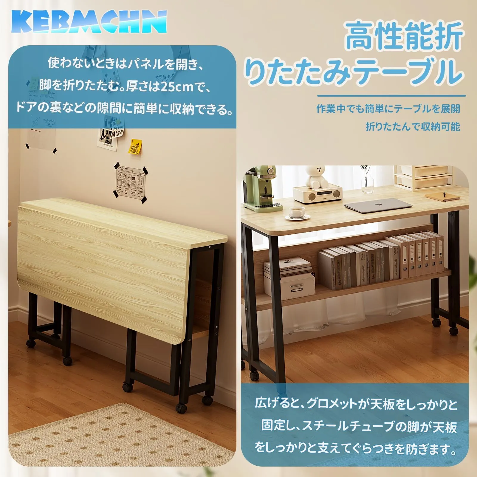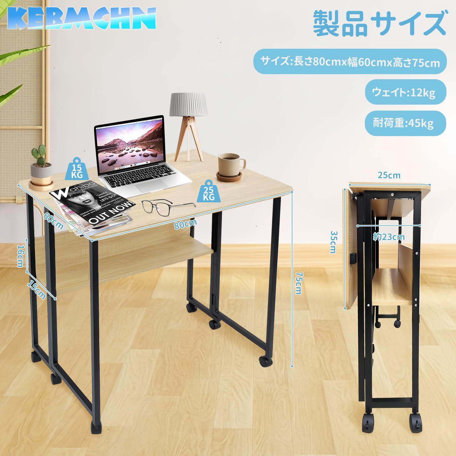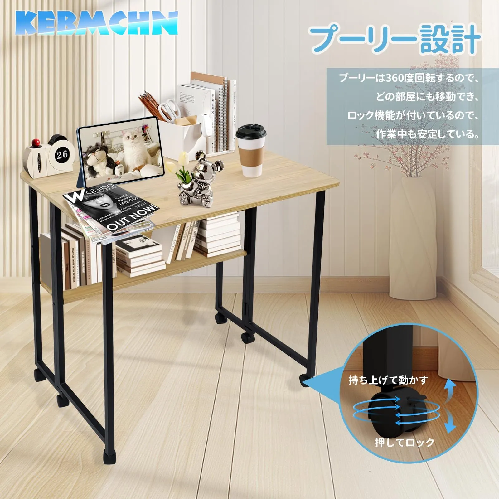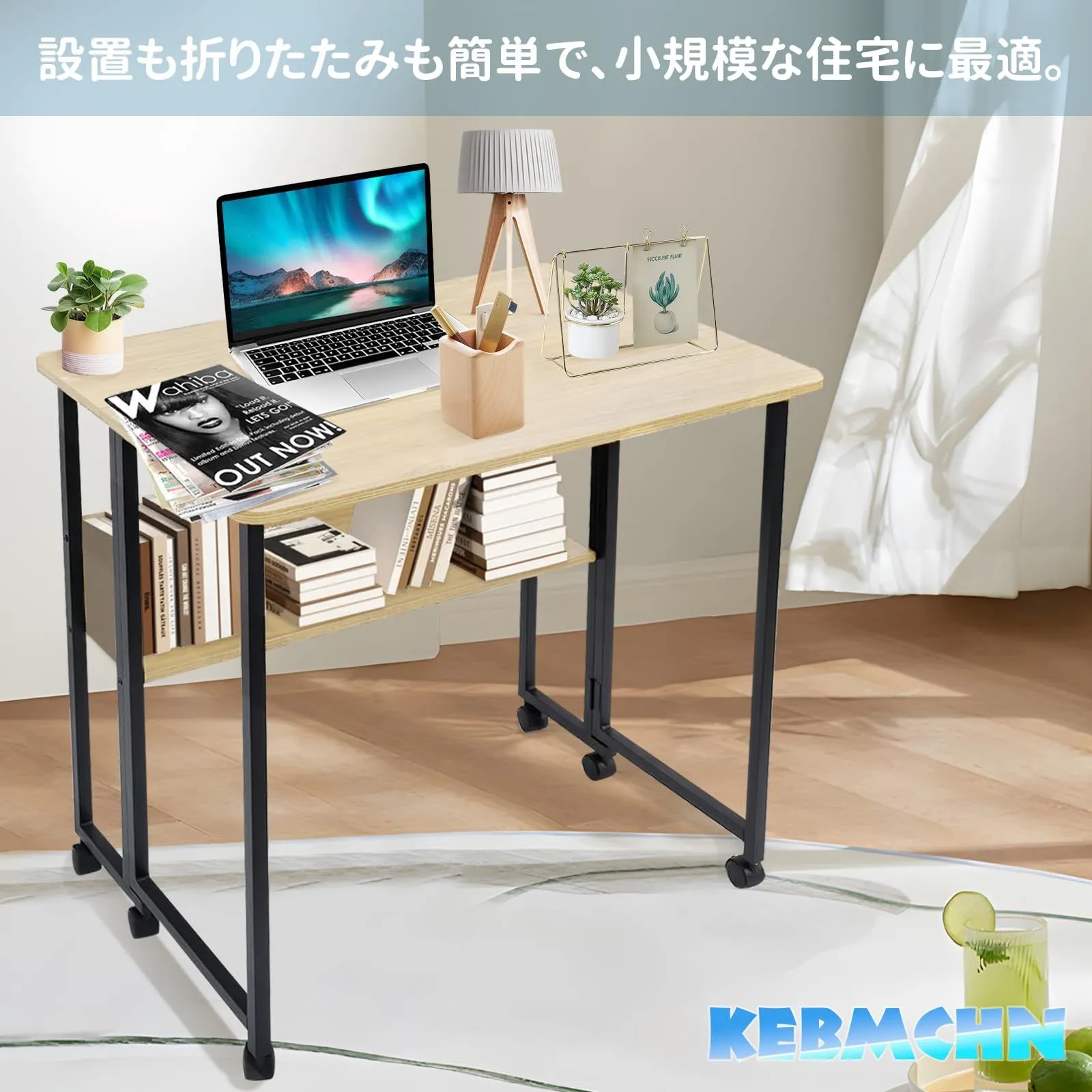 折りたたみ机、木目カラー 勉強机 、キャスター付きテーブル、コンパクト 可動式 パソコンテーブル 、 テレワークデスク、木製 幅80 奥行60 高さ75cm 多機能 省スペース 組み立て簡単 収納パーティション付き 大容量パソコンデスク (木目カラー)