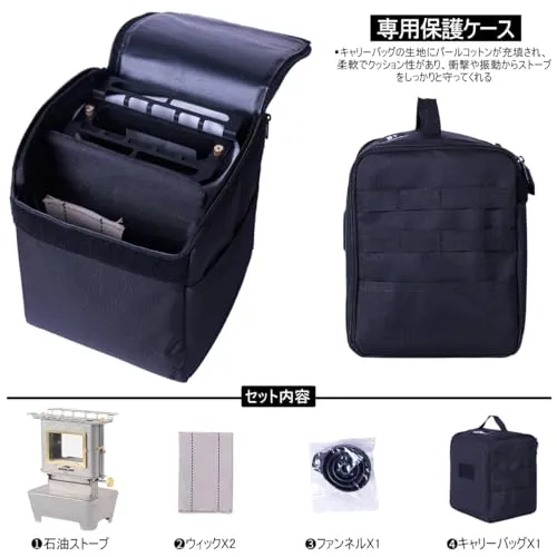 セット内容:アイロンストーブ、ウィックx2、ファンネルx1、キャリーバッグx1となっております。(ご注意ください:使用した後、焼け跡が出るかもしれません、これは正常な現象であり、ご使用には影響しません。)