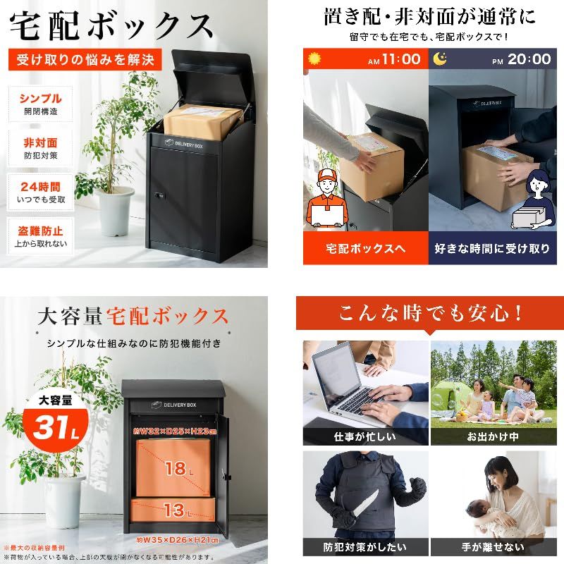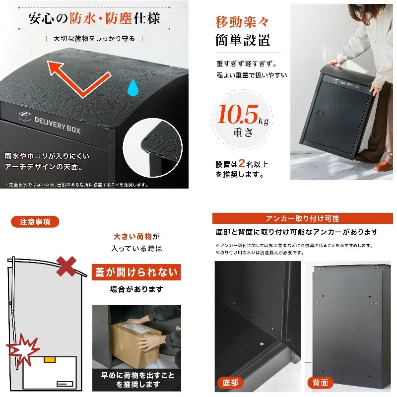 【特徴】 家にいないときや手が離せないときでも安全に受け取れます。 好きな時間に受け取れるので、時間を気にしなくて大丈夫! 容量約31Lの大容量。 幅36cm奥行き27cm高さ16.5cmまでの80サイズの箱が収容可能。 ダイヤル錠付き扉で盗難を防止。安全に受け取れます。 安心の防水・防塵仕様。 雨水やホコリが溜まりにくいアーチデザイン。 背面と底面に固定用アンカー取り付けが可能。 !!お買い上げ前によくお読みください!! サイズをご確認のうえ、ご注文ください。 サイズは個体により若干の差異が生じることがあります。 製品仕様やパッケージは改良のため予告なく変更される場合があります。 サイズ内の荷物でも形状により収納できない場合がございます。 本製品は完全防水ではありません。屋根のある場所に設置してください。 パスワードを忘れた場合の解除に関する保証はできかねます。 不安定な場所には置かないでください。