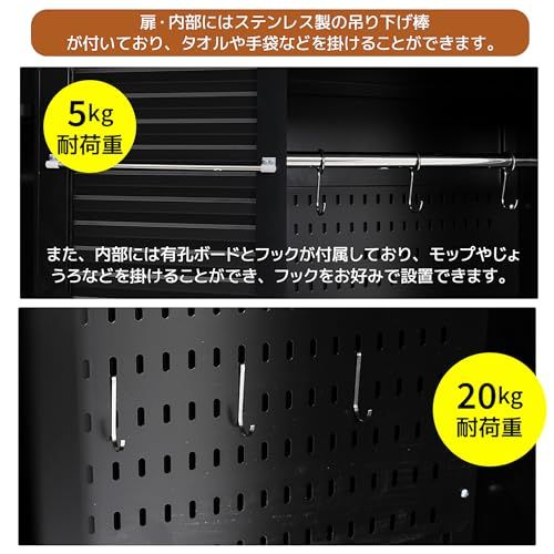 【壁面を有効活用 / ??空?利用低】 掃除道具がバラバラで取り出しにくいストレスを解消。内部には有孔ボード、フック、ステンレス製の吊り下げ棒を完備し、モップやじょうろを「掛ける収納」に変えることで、探す手間をゼロにします。