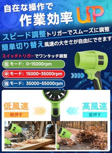 【先進モーター技術】 ジェットブロワーは先進的なターボ技術を採用し、最大55,000 RPM・150 MPHの風速を実現します。これにより、対象エリアの効率的な清掃をサポートいたします。 ※ご注意:湿気の多い環境や濡れた落ち葉が対象の場合は、効率が低下するためご使用をお控えください。