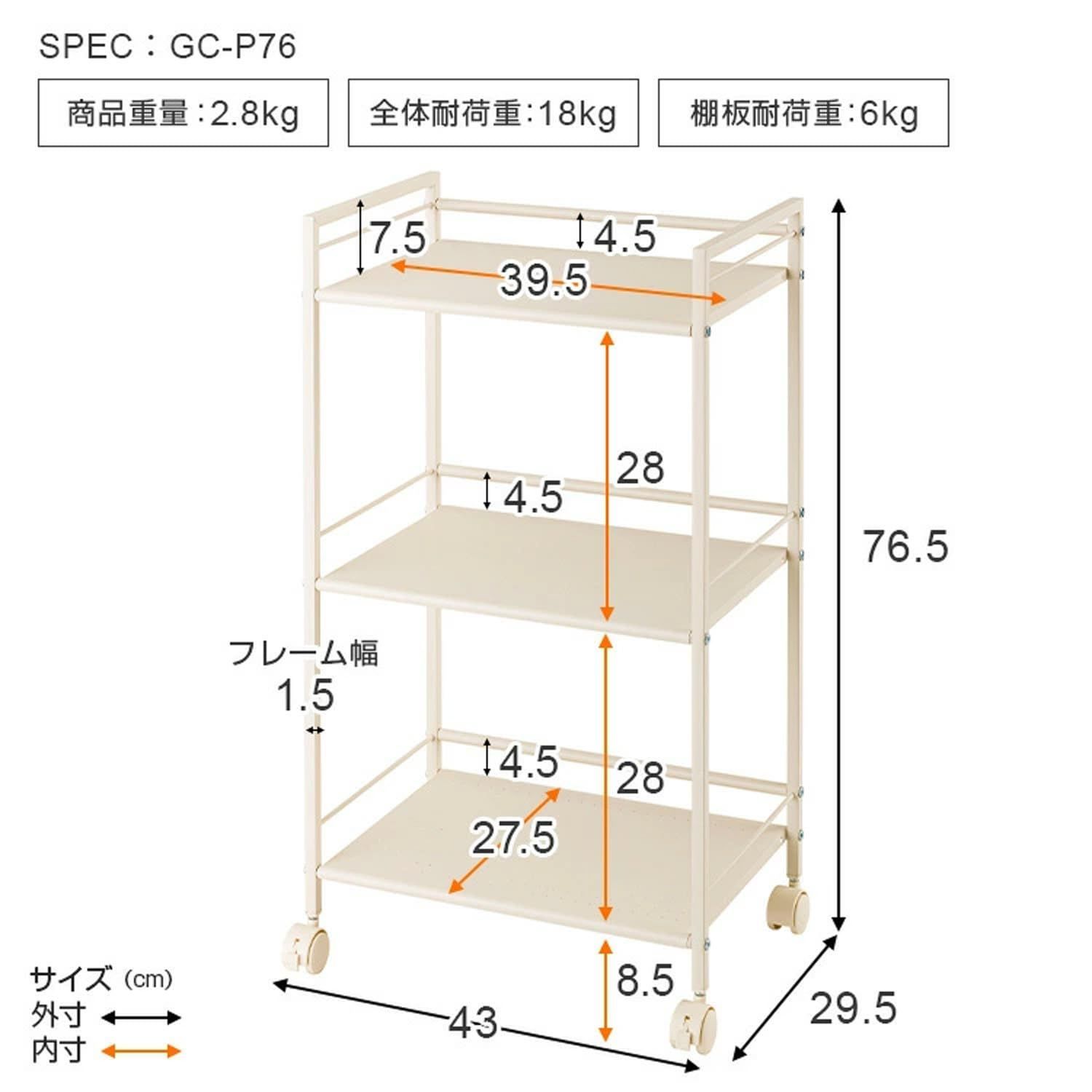 【新着商品】幅43×奥行29.5×高さ76.5cm GC-P76IV アイボリー カラーボックスサイズで使いやすく鉄製パンチングがお手入れ簡単 キャスター付 3段 キッチンワゴン キッチンラック ドウシシャ