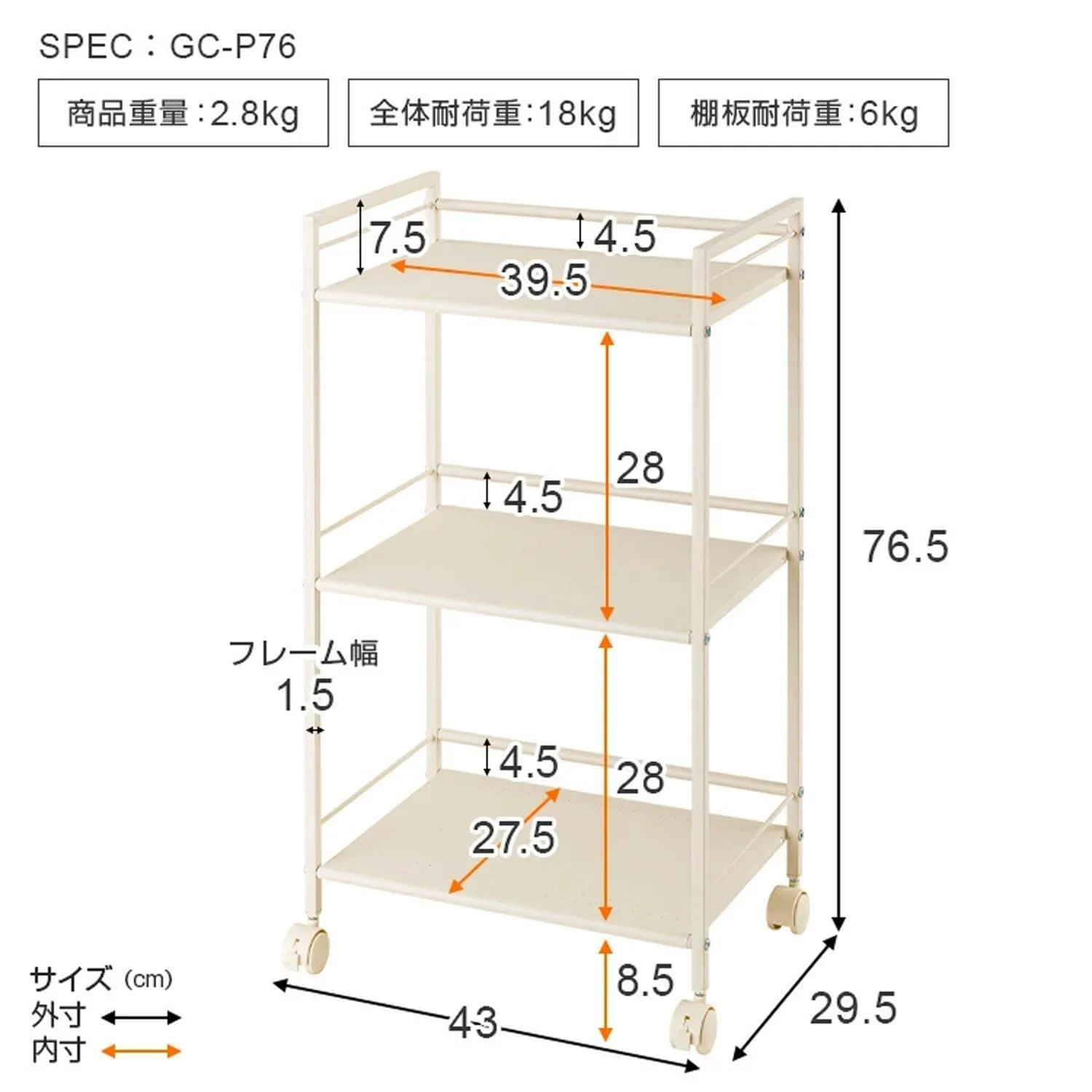 耐荷重:18kg(棚板1枚あたり6kg)